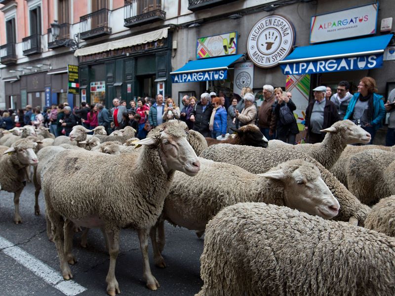 Sheep farmers pay a nominal charge in symbolic acknowledgment of a 1418 agreement with the city council that set a fee of 50 maravedis – medieval coins – per 1,000 sheep brought through the central Sol square and Gran Via street.