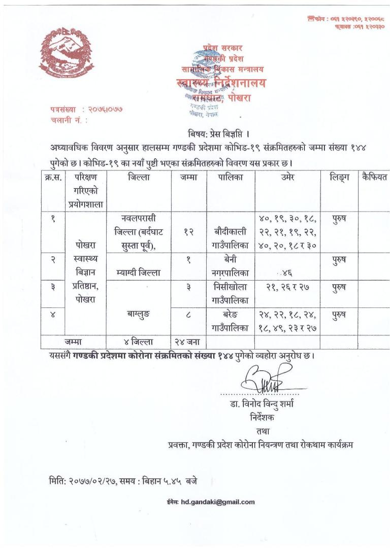 With this, the number of coronavirus cases has reached 144 in the province, confirmed the Ministry of Social Development of Gandaki Pradesh.