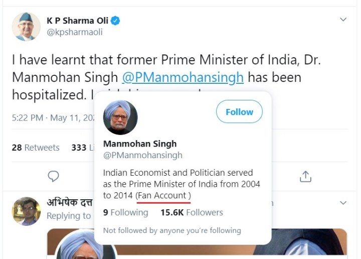 In an earlier tweet, PM Oli’s expressed speedy recovery by mentioning Manmohan Singh’s fan account and not his official one.