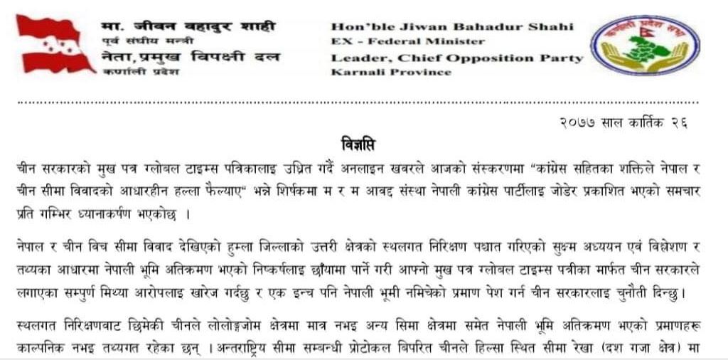Issuing a press note, chief opposition party leader Shahi said he and his party Nepali Congress have been concerned with the news disseminated by The Global Times in which the China government has labeled the conclusion of the field report on the Nepal-China border dispute carried out by the NC team as baseless.