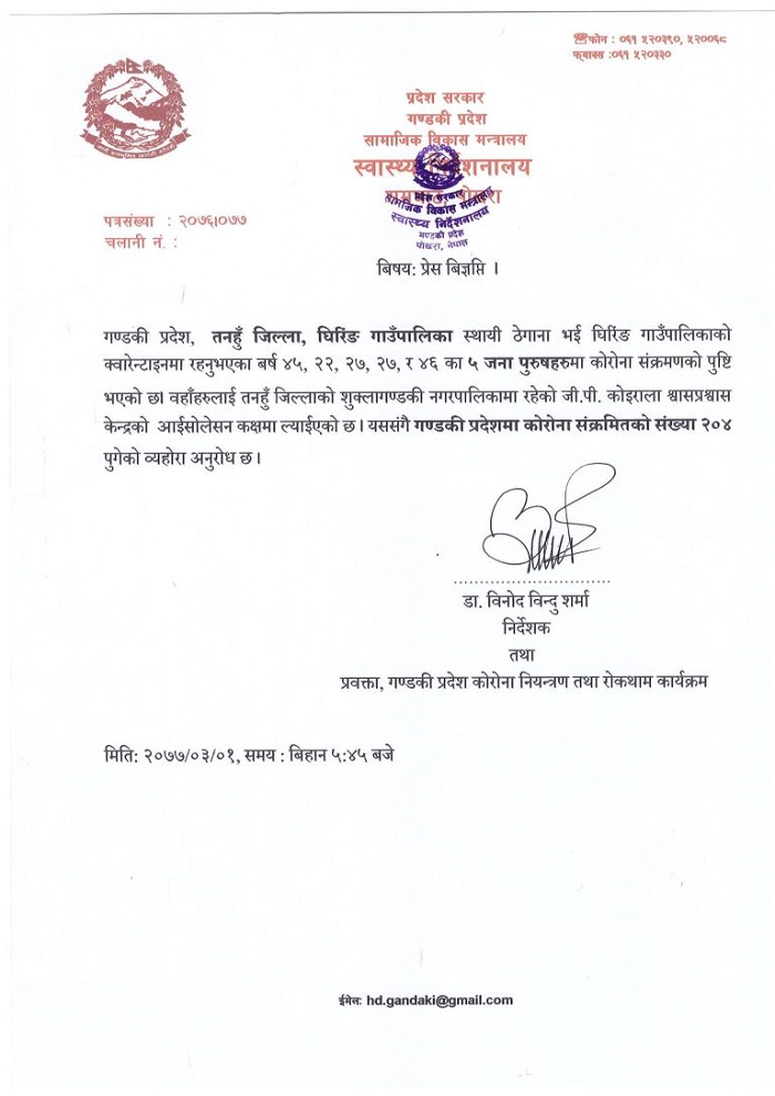 KATHMANDU: The number of coronavirus infection cases has reached 204 in Gandaki Pradesh.