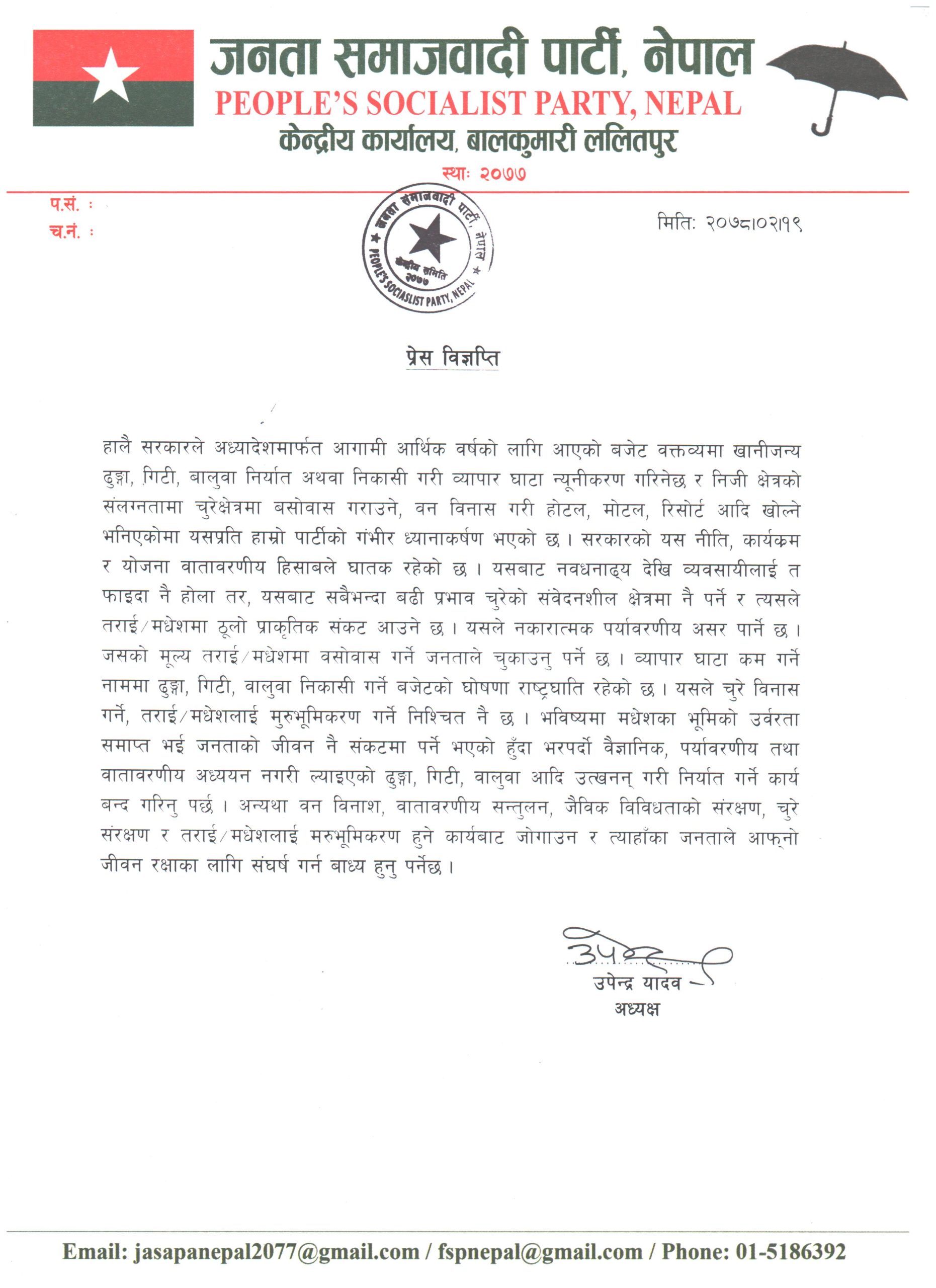 In a press statement issued Wednesday, Chairman Yadav said that the government’s policy of reducing trade deficit by excavating and exporting mineral stones, ballast and sand as mentioned in the budget was environmentally dangerous, the burnt of which had to be borne by the people of Madesh.