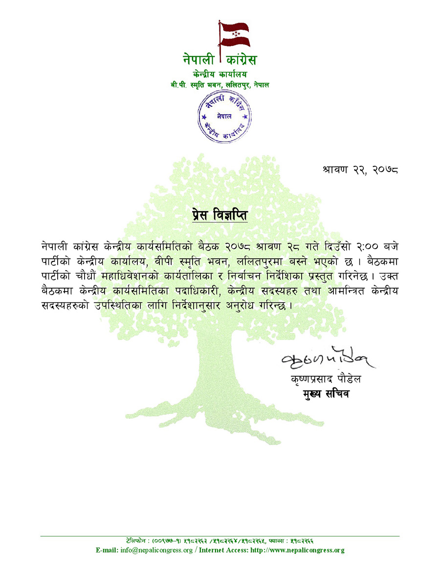 Issuing a statement on Friday, the NC stated that the CWC meet will take place at 2 pm on August 12 at the party’s central office in Sanepa.