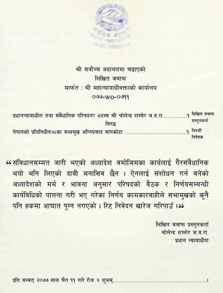 “Everyone has a constitutional duty to abide by the provisions of the constitution,” he wrote in his reply to the Supreme Court, “As the issues raised by the petitioner (Speaker Agni Prasad Sapkota) regarding the ordinance issued under the constitution can be considered by the federal parliament and necessary decisions can be made, it is not rational to argue that the activities done based on the ordinances issued constitutionally are unconstitutional.”