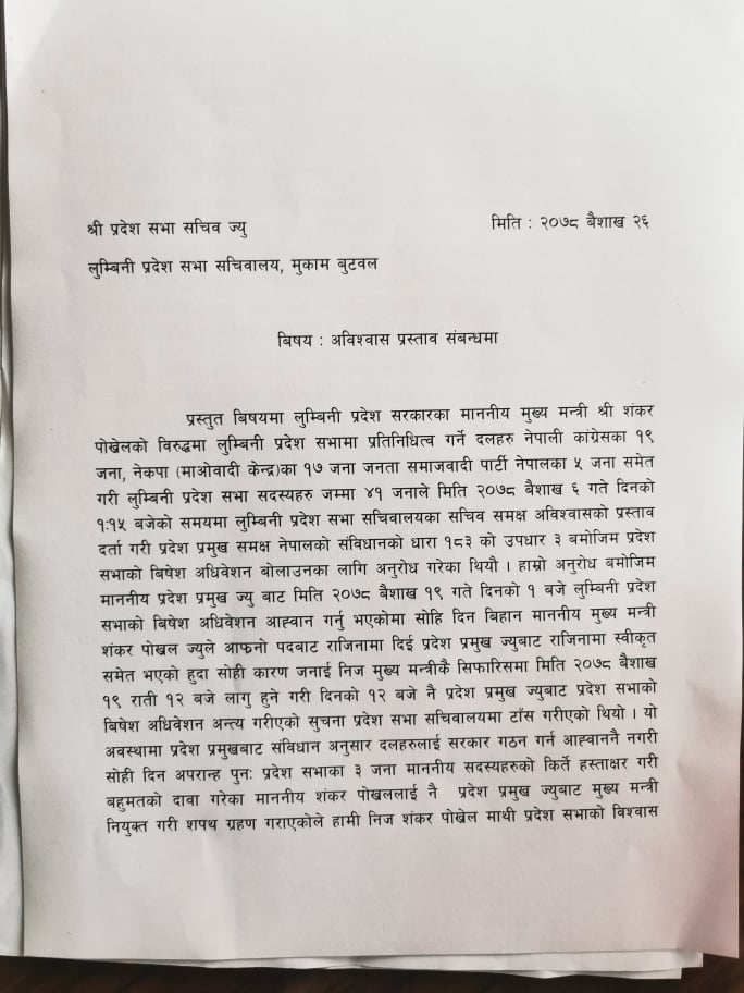 BUTWAL: A no-confidence motion has been filed against Lumbini Chief Minister Shankar Pokharel for the second time this month.