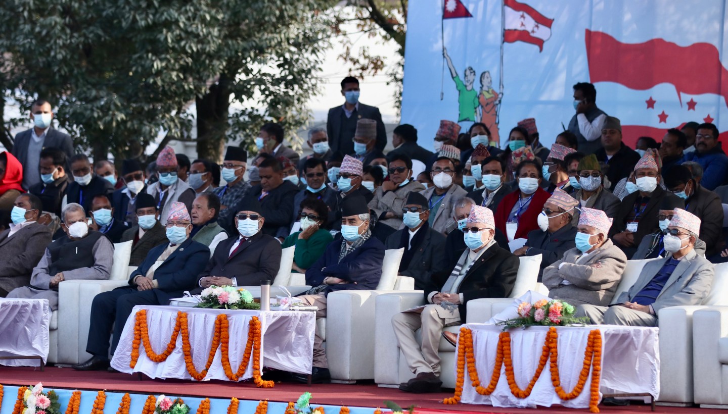 As UML Chair Oli reached Bhrikutimandap to attend the inaugural session of NC’s general convention, he greeted NC President Sher Bahadur Deuba and assumed his seat at the stage. At the same time, he was greeted by Maoist Center Chair Pushpa Kamal Dahal ‘Prachanda’ and CPN-Unified Socialist (CPN-US) Chair Madhav Kumar Nepal, who were seated next to NC President Deuba.