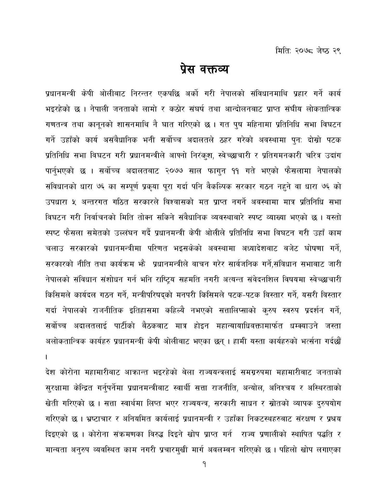 Former PMs Pushpa Kamal Dahal ‘Prachanda’, Sher Bahadur Deuba, Madhav Kumar Nepal, Jhala Nath Khanal and Dr Baburam Bhattarai stated in the statement that PM Oli consistently undermined the rule of law and the federal democratic republic system earned though the long struggle of Nepali people.