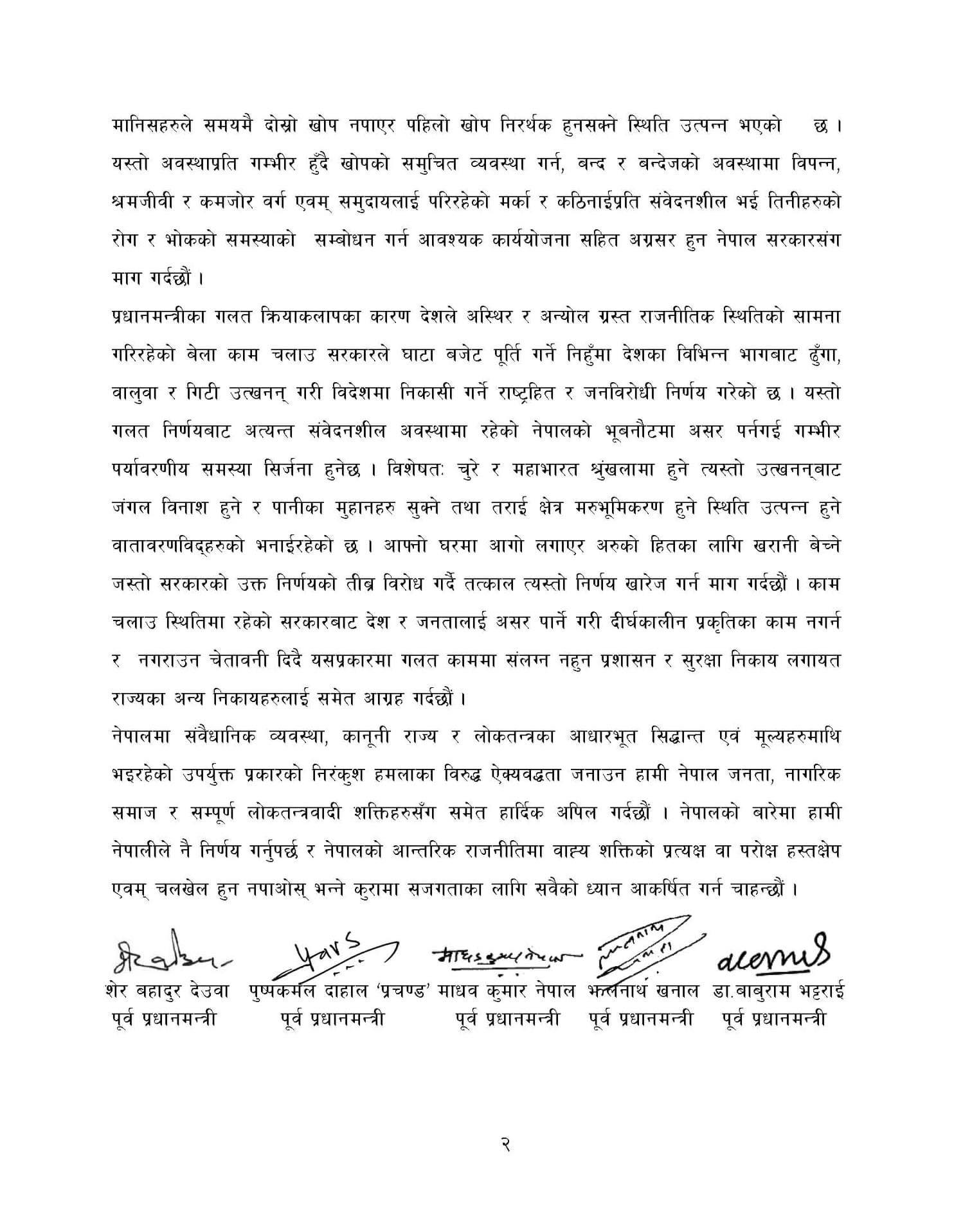 Issuing a joint statement Saturday five former PMs said, “We, Nepalis ought to make decisions about Nepal and we want to draw everyone’s attention to the need to ensure that there is no direct or indirect interference or manipulation of external forces in Nepal’s internal politics.”