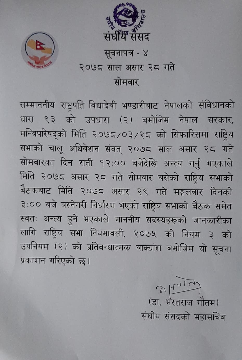 President Bhandari ended the ongoing NA session with effect from midnight Monday.