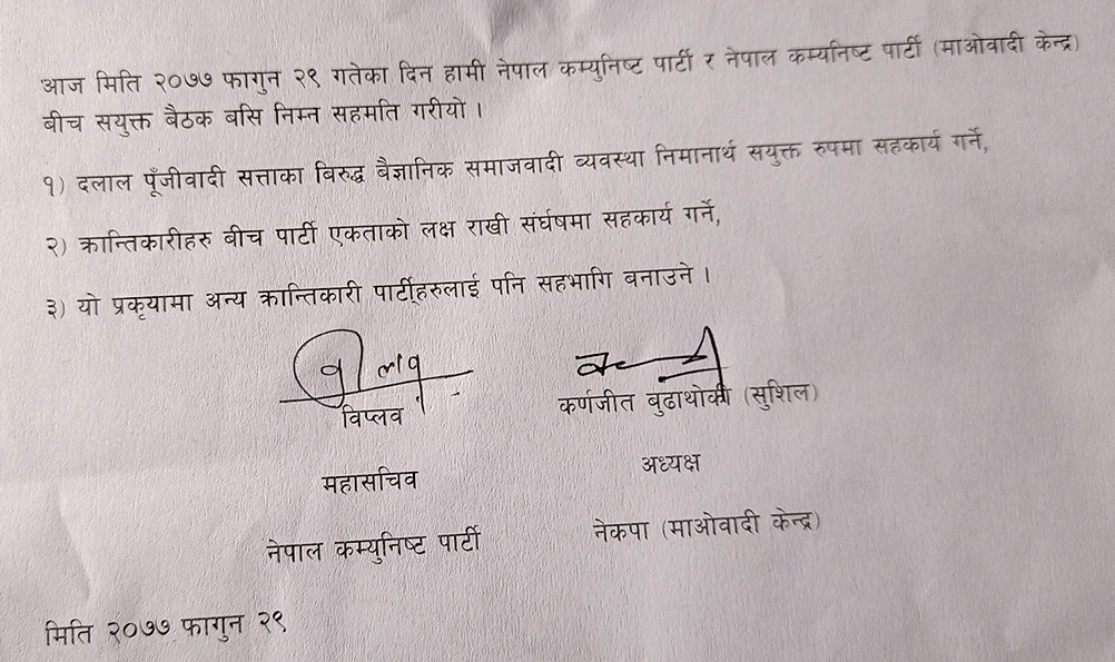 KATHMANDU: Netra Bikram Chanda’ Biplav’ led Nepal Communist Party and Karna Jeet Budhathoki-led Nepal Communist Party (Maoist Center) signed a three-point agreement on cooperation to form party unity.