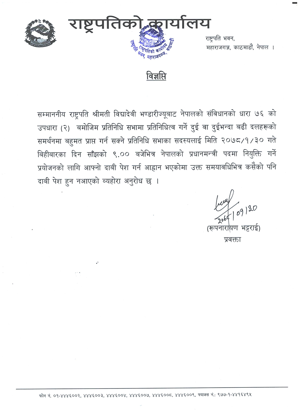KATHMANDU: The President’s Office Thursday evening has issued a notice formally stating none of the members of House of Representatives (HoR) had come forward to form a majority government under Article 76 (2) of the constitution.