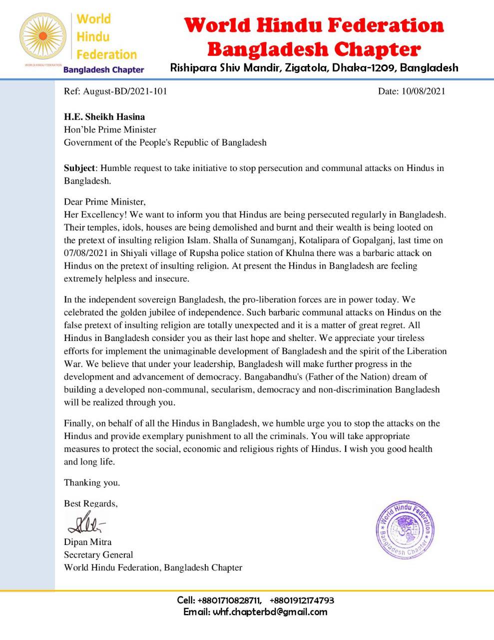 Secretary-General Dipan Mitra of the chapter, addressing the statement to Bangladeshi Prime Minister Sheikh Hasina, stated that the Hindus in Bangladesh feel extremely powerless and insecure as the pro-liberation forces hold power in the country and as such, they consider the PM their last hope and shelter.