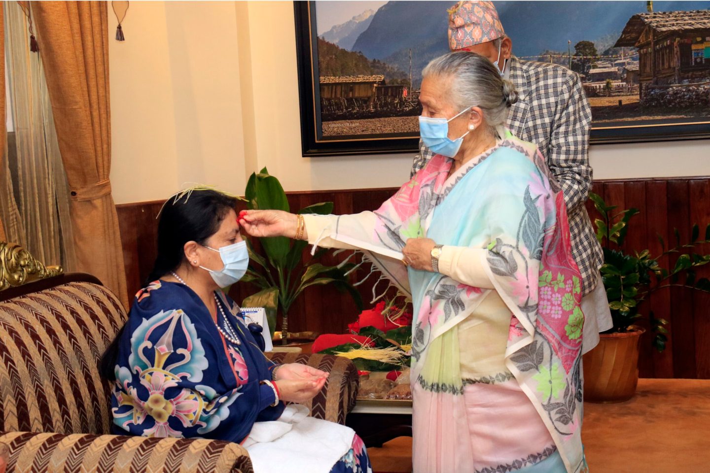 The Head-of-the-State received tika , jamara and blessings from her mother on the occasion of the Bijaya Dashami at the Office of the President. Similarly, the President was also offered the Dashain tika from main priest of Hanuman Dhoka, Devraj Aryal. Priests from temples of several deities offered prasad to the President.