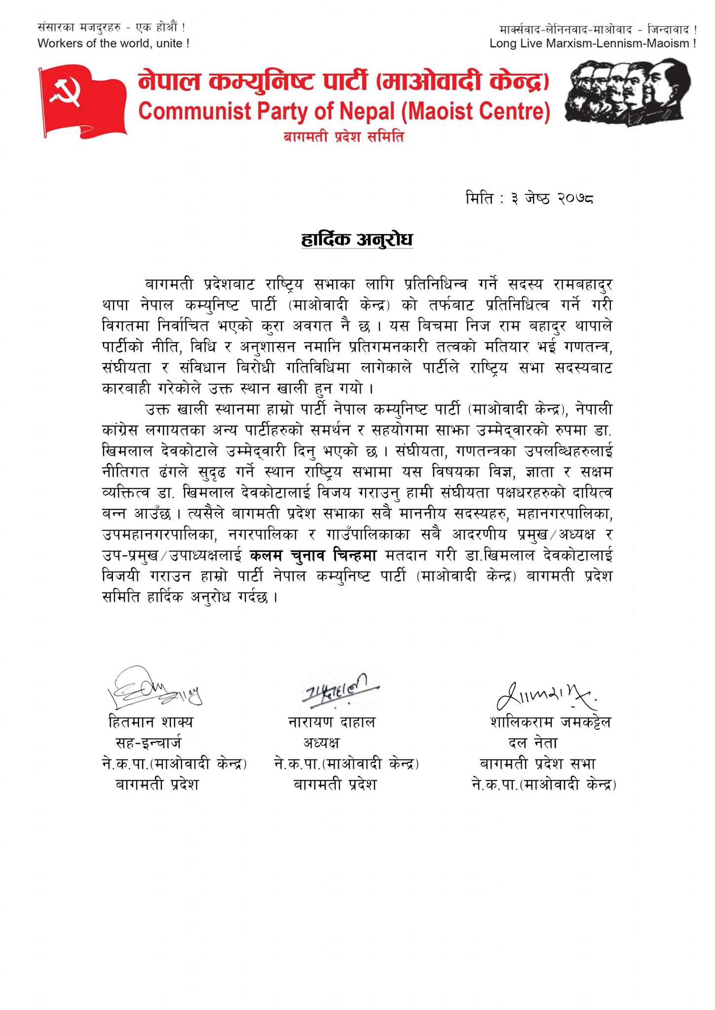 Maoist Center Bagmati Deputy In-charge Hit Man Shakya, Province Chairman Narayan Dahal and parliamentary party (PP) leader Shalikram Jammarkattel issued a joint statement Monday urging voters to cast their ballot to Devkota.