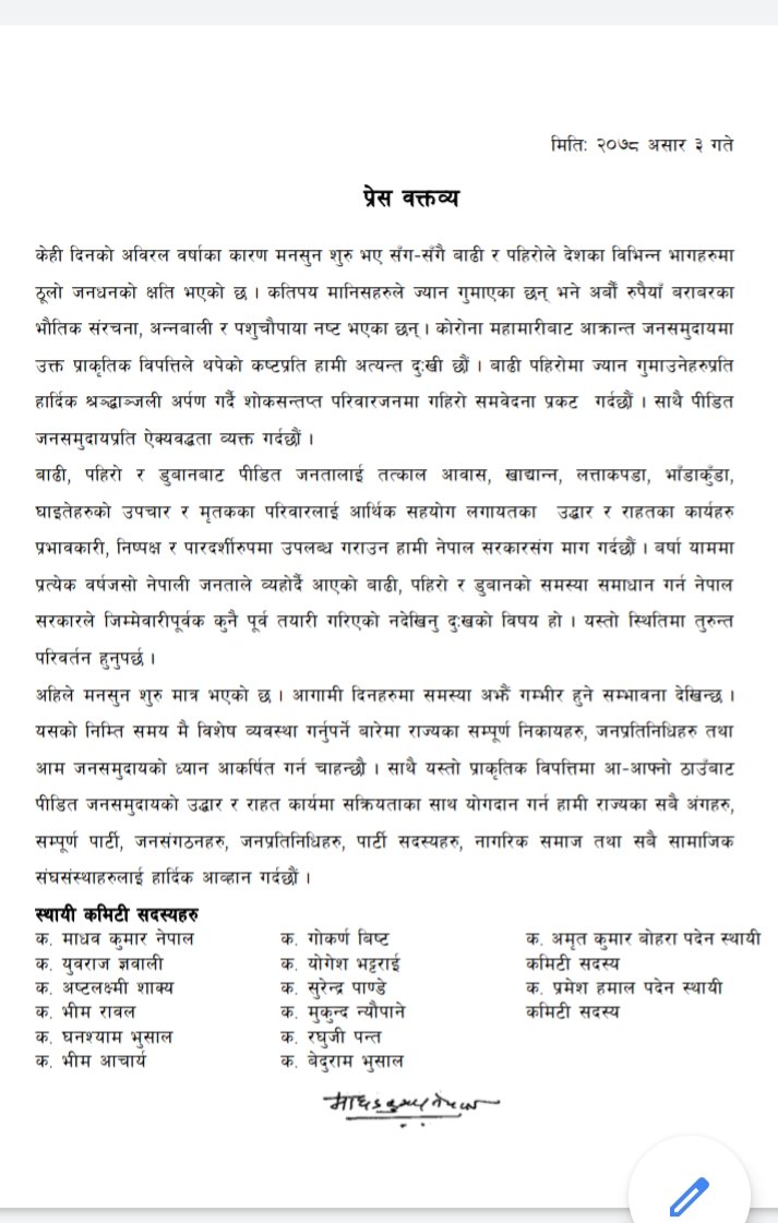 The virtual meeting was attended by 14 SC members of the Nepal faction. They also issued a statement after the meeting.