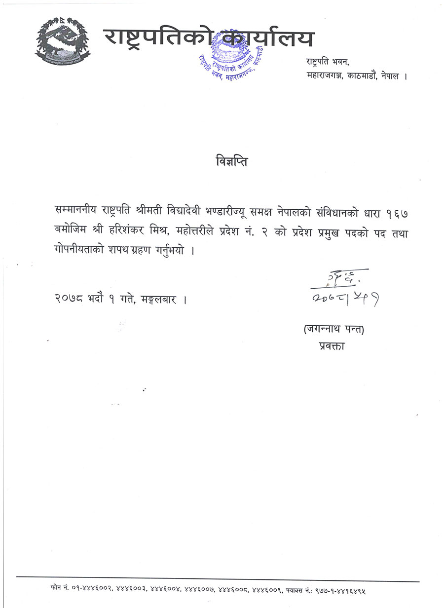 KATHMANDU: Newly-appointed Governor of Province 2 Hari Shankar Mishra has taken oath of office and secrecy.