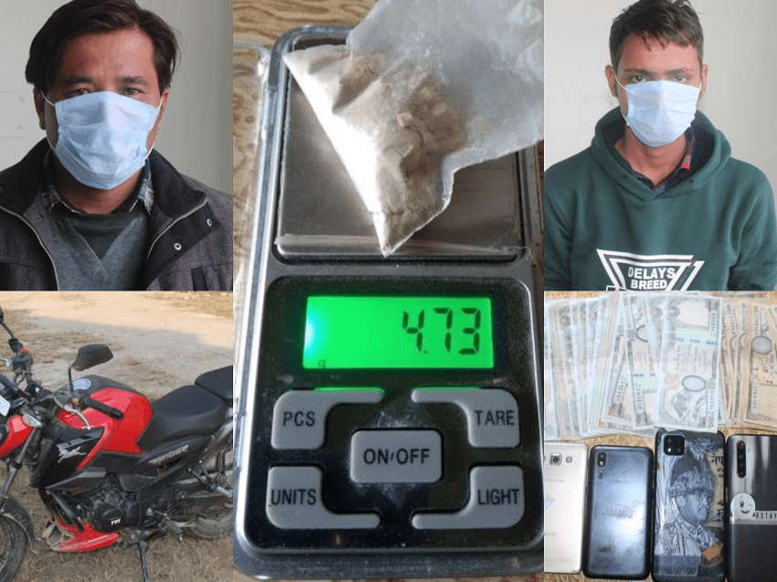 According to the District Police Office, Kanchanpur, they have seized 4.47 grams of brown heroin, eight mobile phone sets, a motorcycle (Lu 81 Pa) and Rs. 64 thousand cash from Bhatta.
