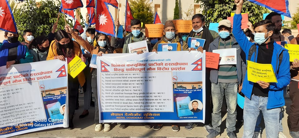 KATHMANDU: Nepal Democrat Union (NDU) has organized a protest to draw the attention of lawmakers against China’s negative influences and interventions in internal affairs of the country, in New Baneshwor, Kathmandu, Friday.