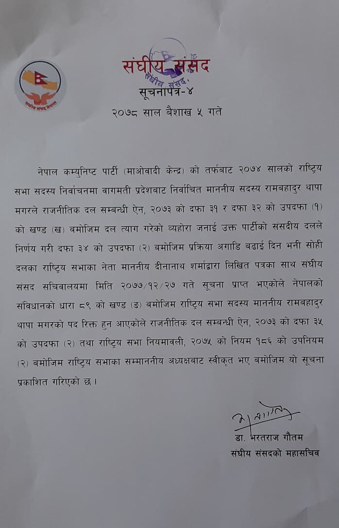 The Parliament Secretariat has on Sunday issued a notice saying that Thapa was no longer a lawmaker in the National Assembly.
