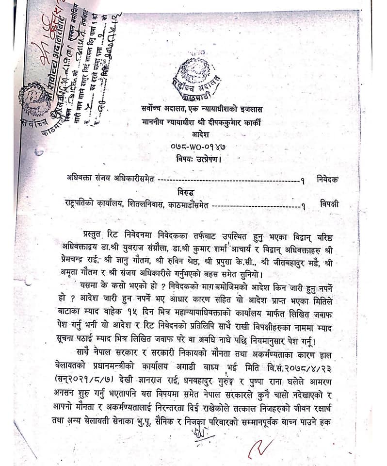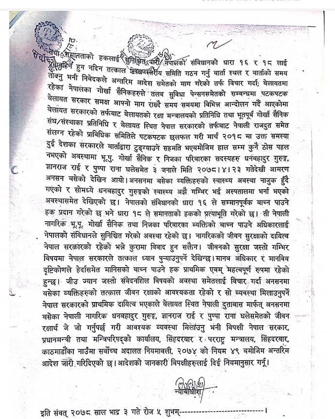 KATHMANDU: The Supreme Court has issued an order in the name of the government to take initiatives to save the lives of Gurkha soldiers who are staging a hunger strike in the UK demanding equal pension rights as that of British soldiers.