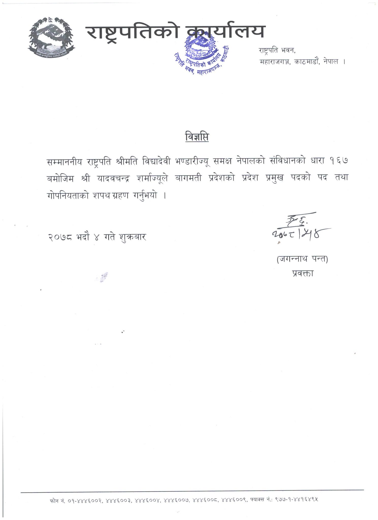 Earlier in the day, President Bhandari appointed Sharma as the governor in Bagmati Province on the recommendation of the cabinet. The cabinet recommended him for the post Thursday.