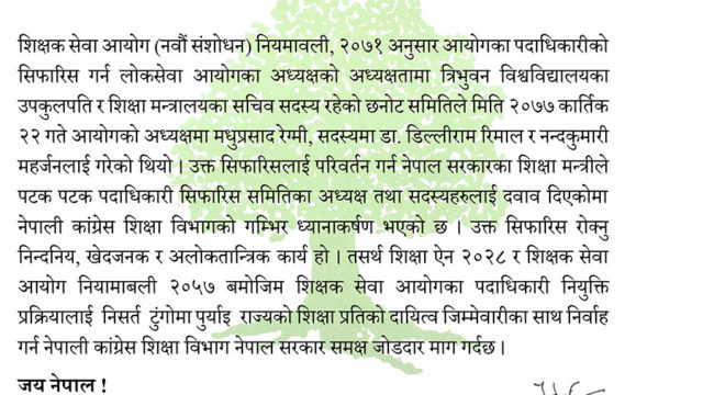 “We have learnt that Education Minister has been repeatedly putting pressure on the recommendation of the selection committee comprising the Tribhuvan University Vice Chancellor and Education Ministry’s Secretary to change the recommendation,” NC statement reads, “We demand the completion of selection process as per the Education Act 1971 and Teachers Service Commission Regulations 2000.”
