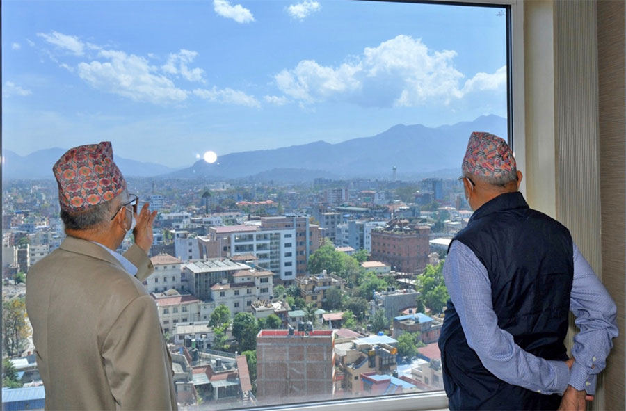 Prime Minister’s Press Adviser Surya Thapa tweeted saying that Prime Minister KP Oli and former Prime Minister and Member of Parliament Madhav Kumar Nepal jointly view the newly constructed tower in Sundhara from the window of the meeting room of the Marriott Hotel in Nagpakhari.