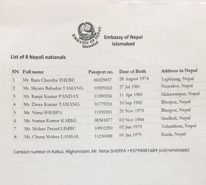 According to the Nepali Mission in Islamabad’s list, Ram Chandra Thebe, Shyam Bahadur Tamang, Ranjit Kumar Panday, Dawa Kumar Tamang, Nima Sherpa, Suman Kumar Karki, Mohan Prasad Limbu and Chuna Mohan Lamsal, who worked for the Afghan Wireless company, along with their Philippine co-workers are in Kabul seeking permission to fly to Pakistan.