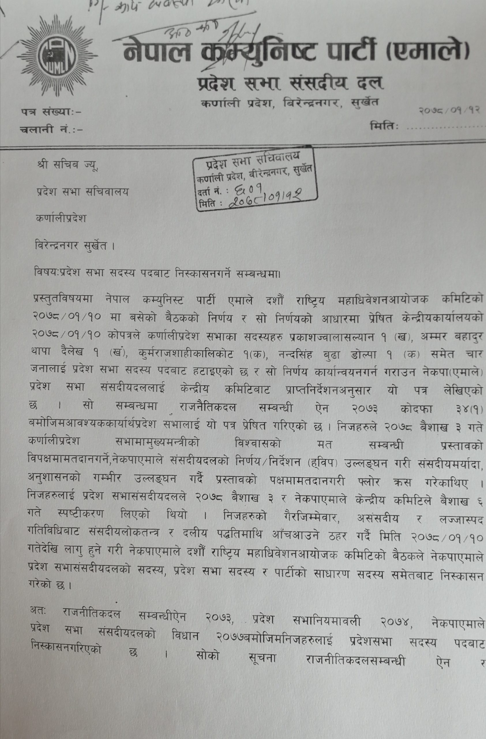 KATHMANDU: The provincial parliamentary party (PP) CPN-UML has registered a letter, seeking the dismissal of four ‘floor-crossing’ provincial lawmakers of the party from the Karnali Province Assembly (PA), with the PA Secretariat in Birendranagar, Surkhet, Sunday.