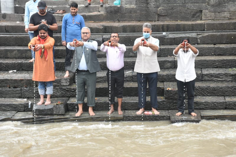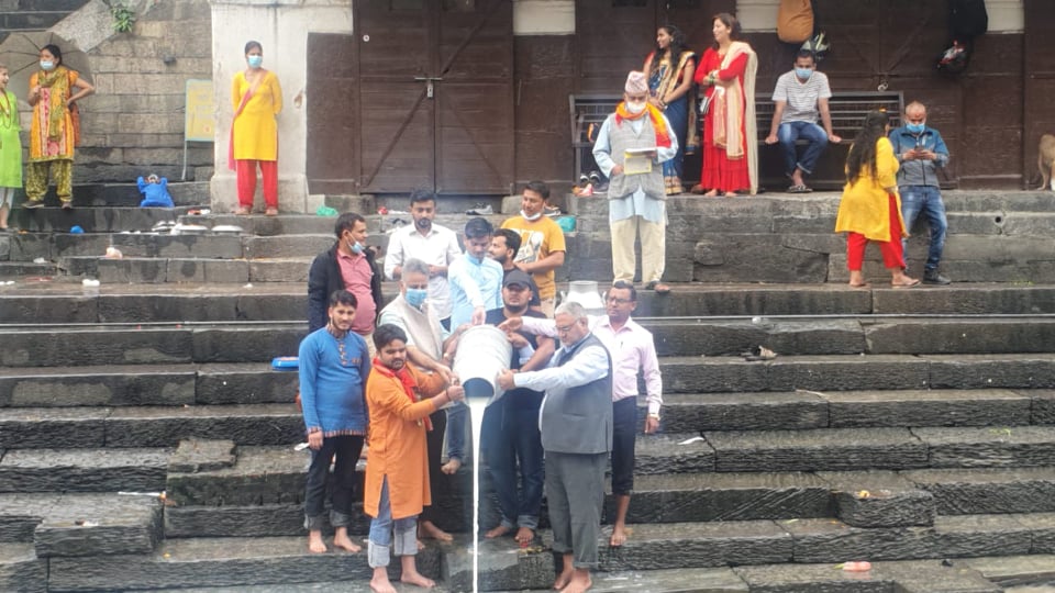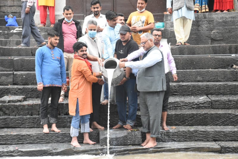 KATHMANDU: Former Minister Uma Shankar Argaria has offered 100 liters of milk at the holy Bagmati river near the sacred Hindu site, Pashupatinath temple, in Kathmandu, Monday.