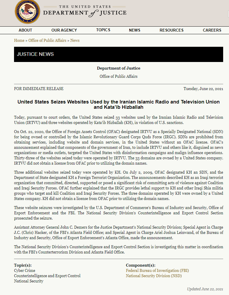 The seizures were in accordance with court orders as US companies owned the domains, said a statement issued by the US Department of Justice (DoJ) on June 22. According to the statement, Iranian government components, including IRTVU and others, used the websites in disguise of news organizations or media outlets to target the US with disinformation campaigns and malign influence operations.