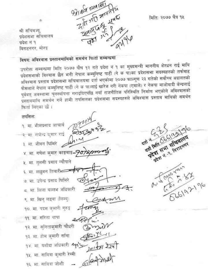 As many as 16 PA members of the CPN-UML have notified the Secretary at the Province 1 Assembly Secretariat that they will not be moving forward with the no-confidence motion.