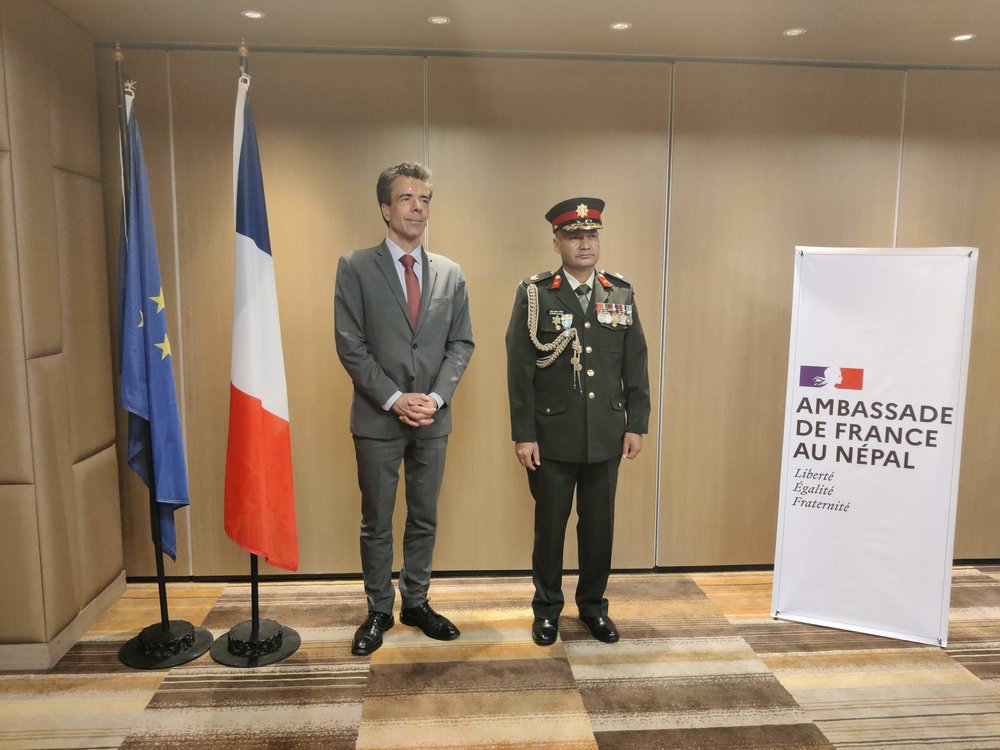 French Ambassador François-Xavier Léger (R) and Brigadier General Suresh Baniya.