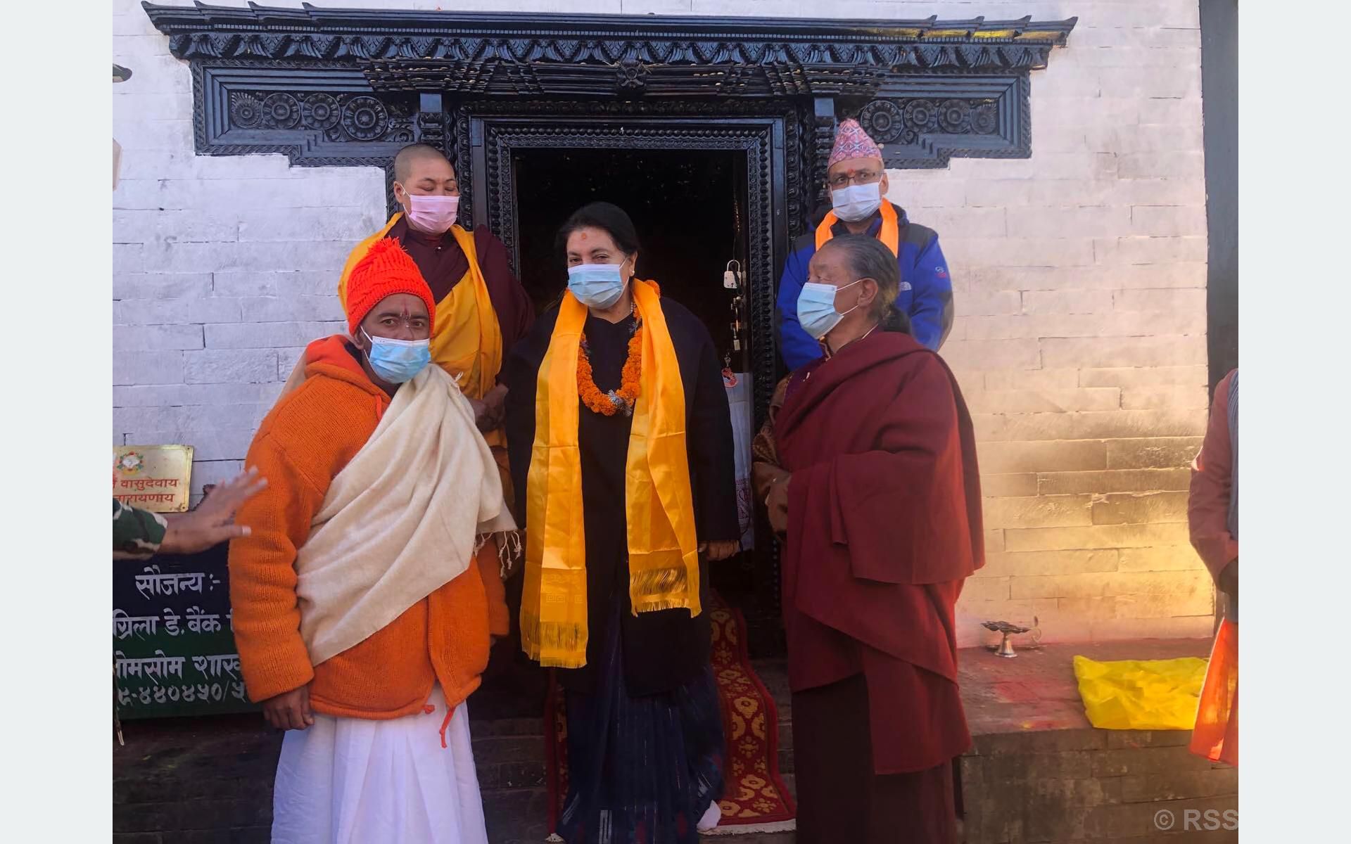 On the occasion, President Bhandari received prasad from temple priest Krishna Prasad Subedi and nun Karpo.