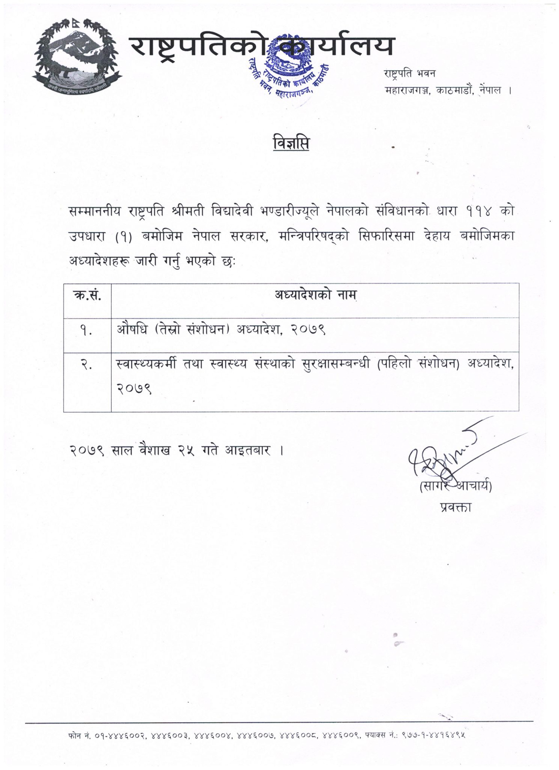 Issuing a press statement, the President’s Office stated that the president issued the Medicine (Third Amendment) Ordinance, 2079 BS and the Ordinance on the Protection of Health Workers and Health Institutions (First Amendment) Ordinance, 2079 BS.