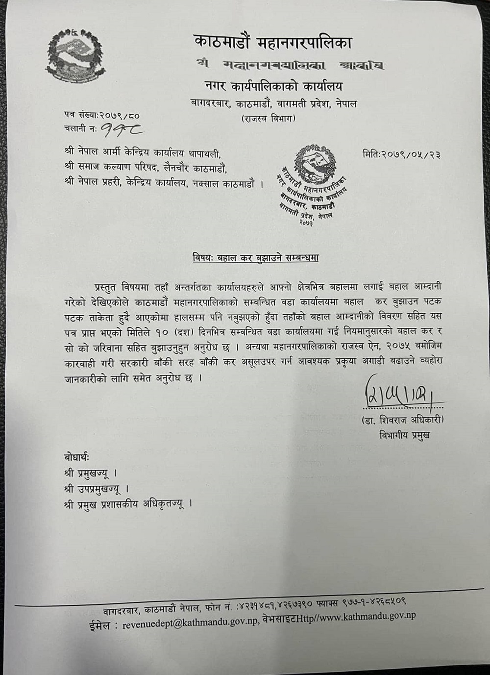 A letter was dispatched to the NA and Nepal Police asking them to visit respective ward offices to pay rent taxes within 10 days of the receipt of the document.