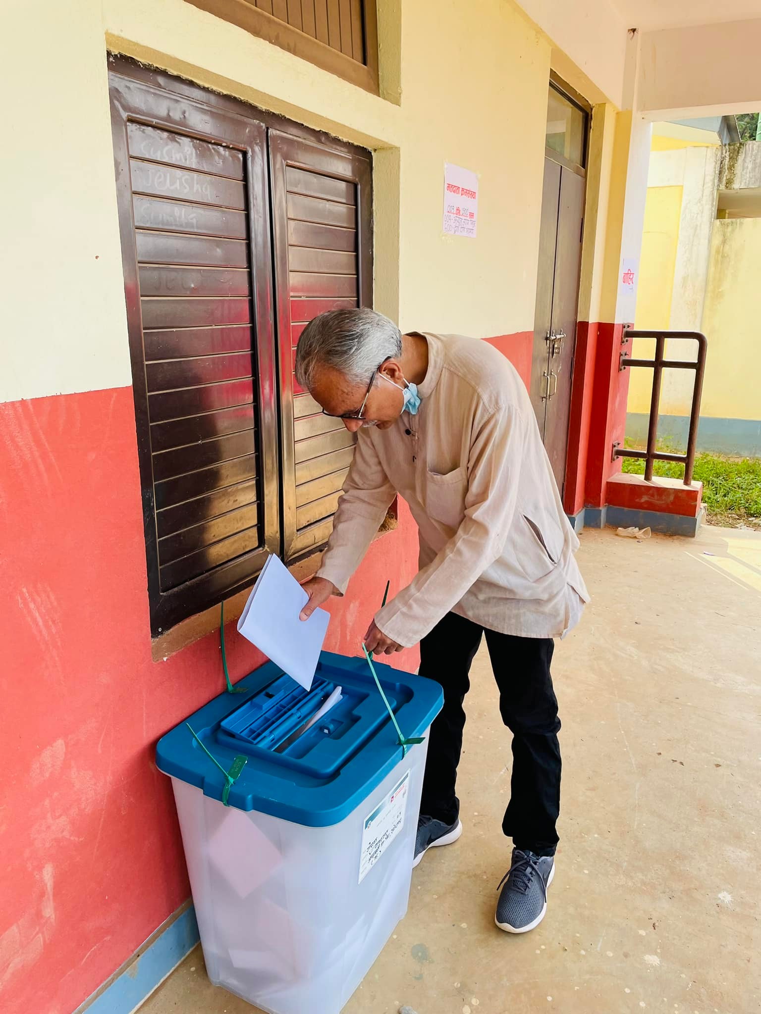 GORKHA: Former Prime Minister and Chairman of Janata Samajbadi Party Dr Babu Ram Bhattarai cast his vote at the Annapurna Secondary School booth in Gorkha at 8.25 in the morning.