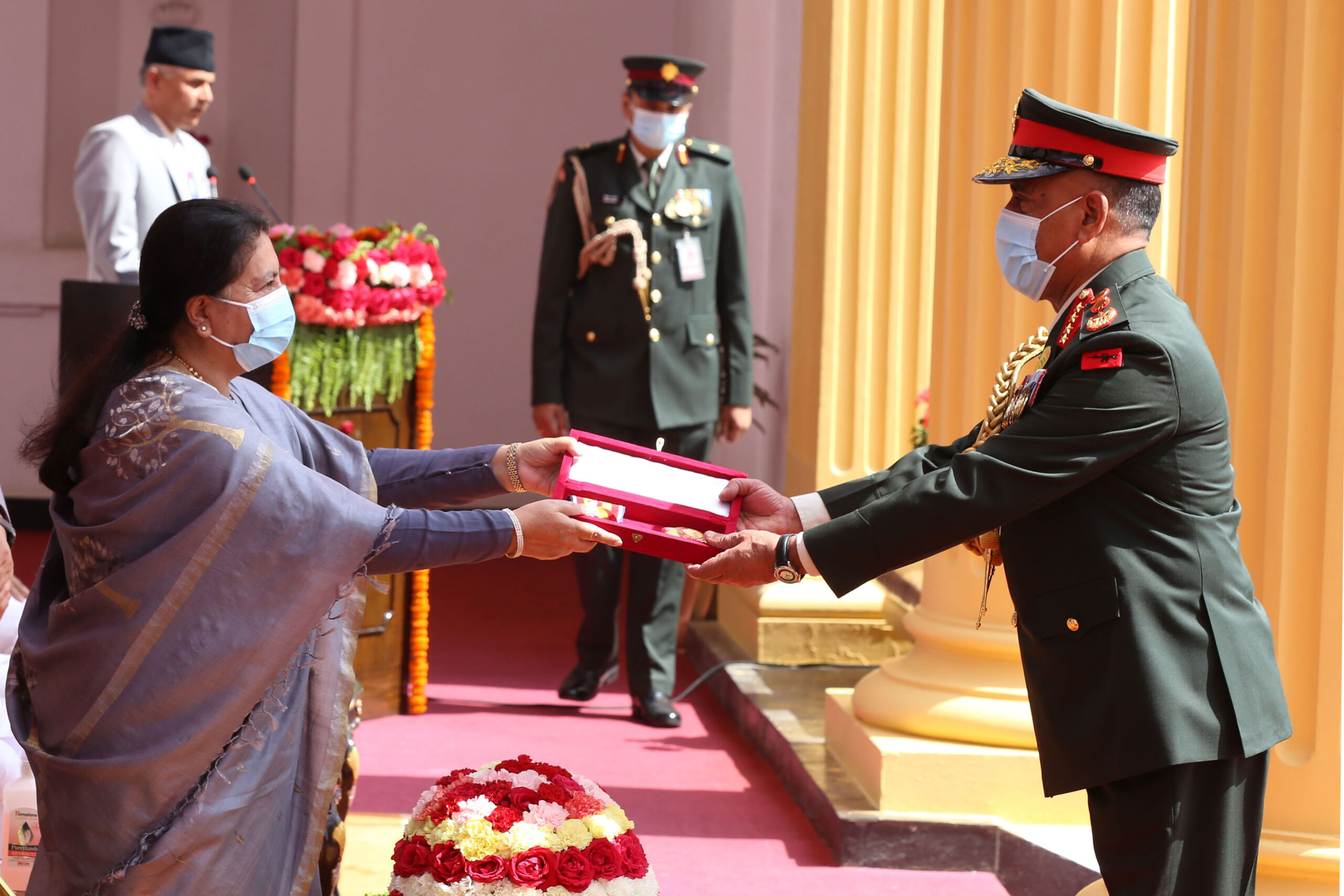 KATHMANDU: President Bidya Devi Bhandari today decorated distinguished persons, civil servants and individuals from the social sector with various decorations and titles, which were announced on the occasion of the Constitution Day (National Day) 2078 BS.