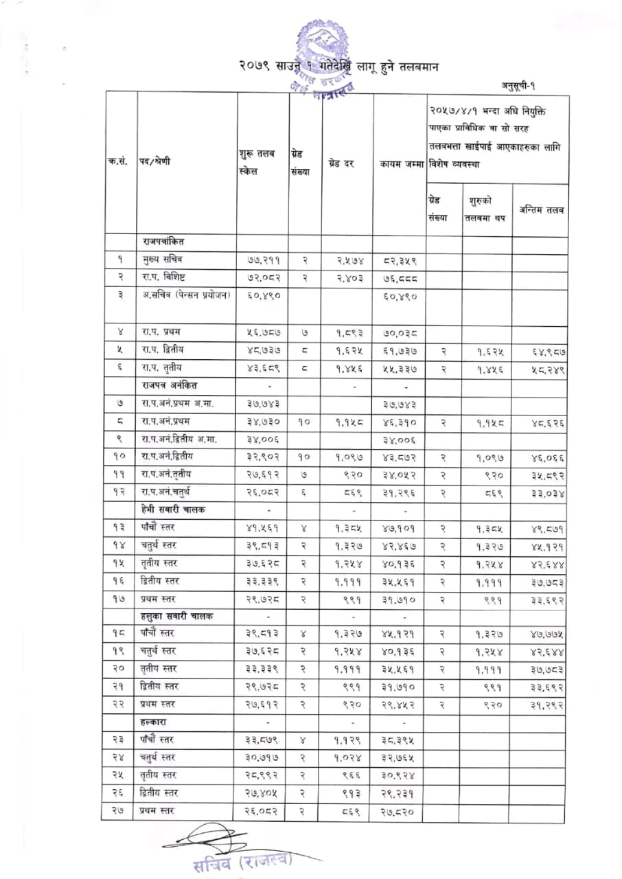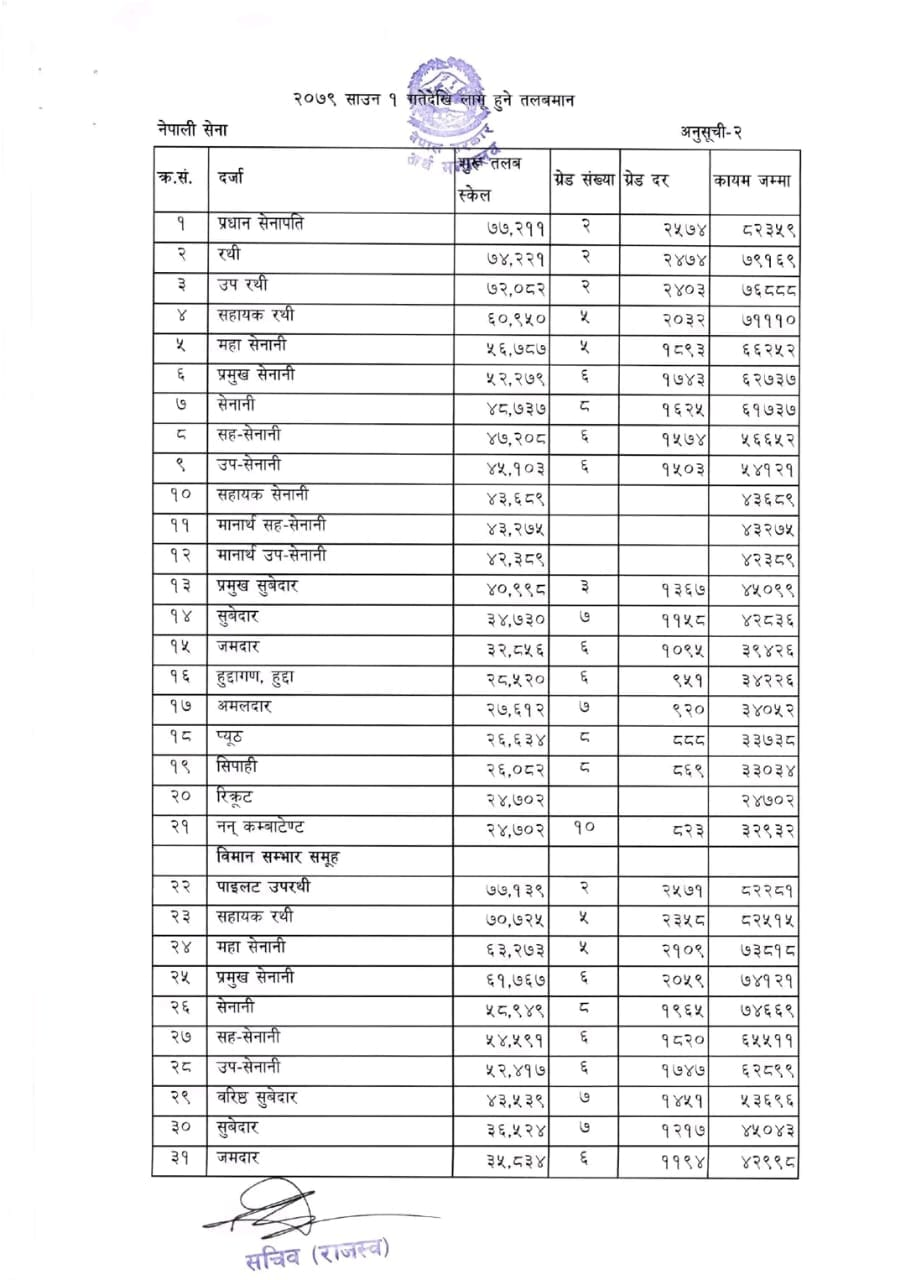 All levels of civil servants, Nepali Army, Nepal Police, Armed Police Force, Health Service, Parliament Service, teachers of public schools and provincial and local level employees are covered in the new pay scale.