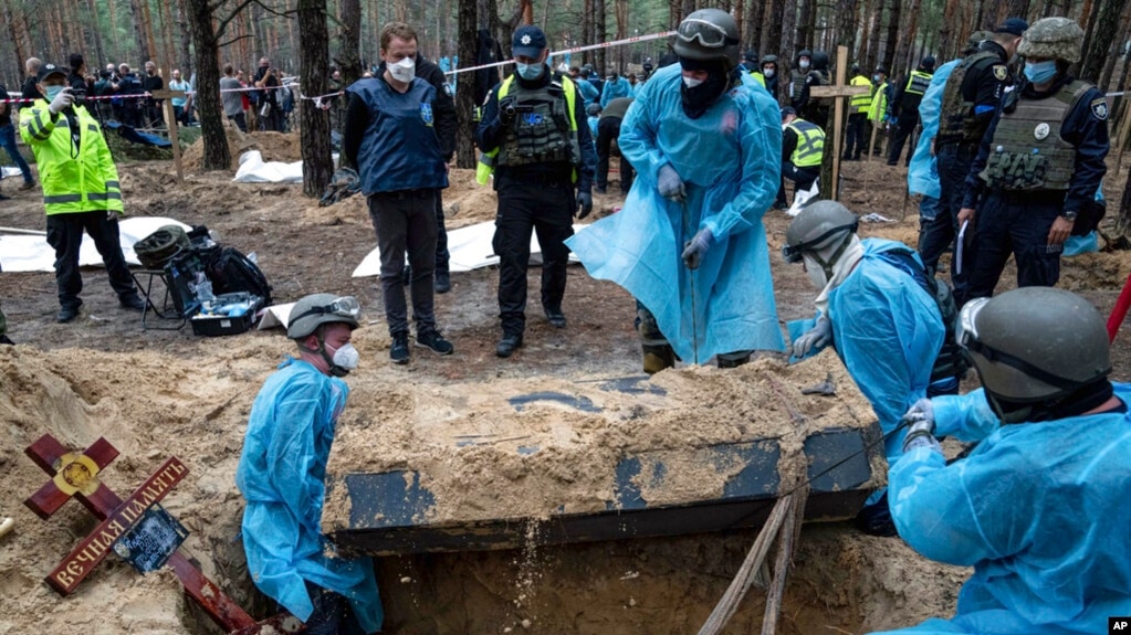 Officials said the total number of victims in Izium had yet to be determined but that many of the bodies had broken limbs and some were buried with ropes around their necks.