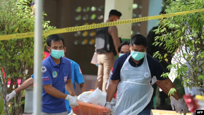 FILE – Paramedics take away a body after four Thai civil defense volunteers were shot and killed outside of a school in the restive southern province of Pattani, Thailand, Jan. 10, 2019.