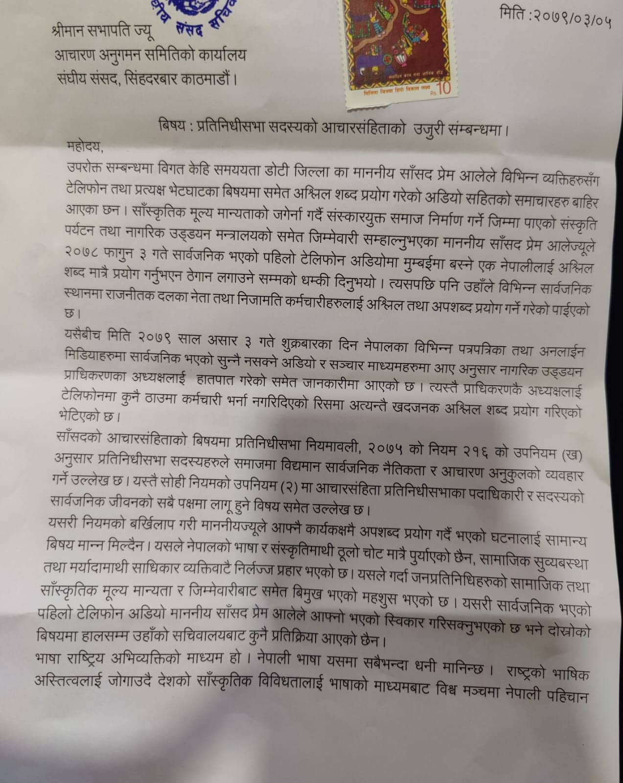 “For some time now, there have been reports of Minister Prem Bahadur Ale using obscene words in telephone and face-to-face meetings with various people. According to the audio and media reports made public in various newspapers and online media of Nepal a few days ago, Chairman of the Civil Aviation Authority was also assaulted by Minister Ale. We request the Member of Parliament to test the audio and recommend it for further investigation,” the complaint reads.