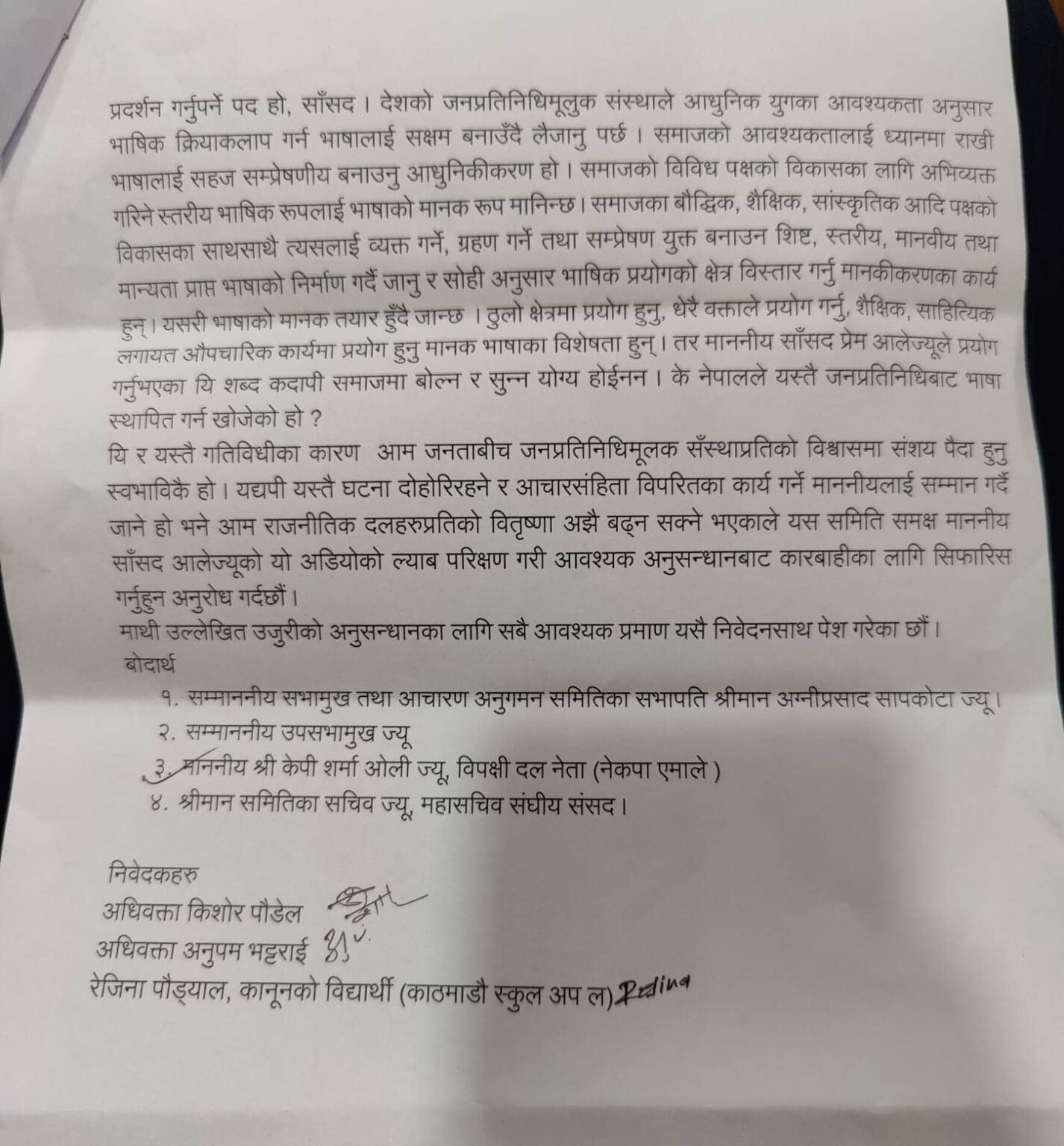 This has not only hurt the language and culture of Nepal, it has also been a shameless attack on the dignity of the social security system,” the complaint letter further reads.
