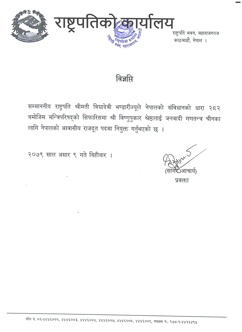 KATHMANDU: President Bidya Devi Bhandari on Thursday appointed Bishnu Pukar Shrestha as Nepal’s residential ambassador to the People’s Republic of China (PRC).