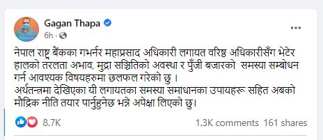 “I met NRB Governor Maha Prasad Adhikari and other senior officials to discuss the current liquidity crunch, monetary reserves and capital market problems,” he wrote.