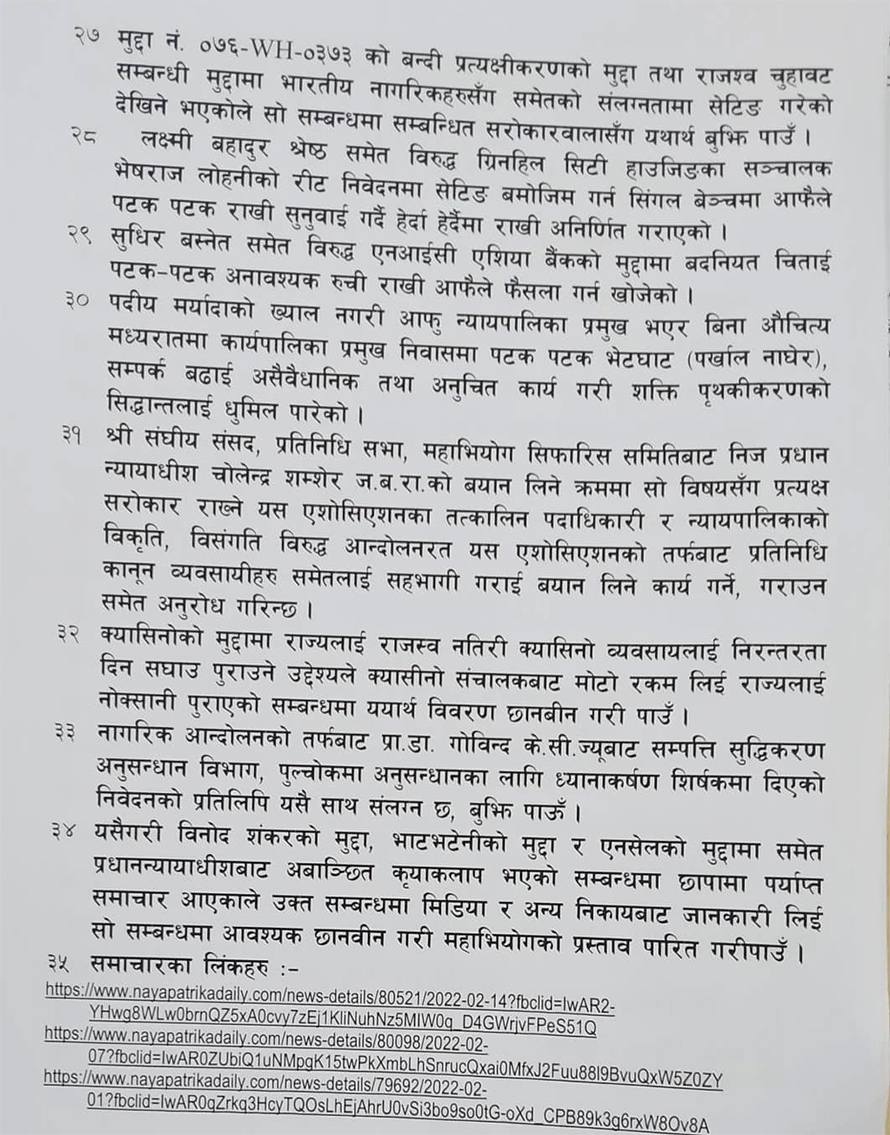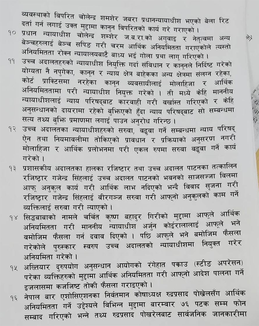KATHMANDU: The Nepal Bar Association has submitted a 34-point letter as evidence to the Parliament’s impeachment recommendation committee to impeach the suspended Chief Justice Cholendra Shumsher Rana.