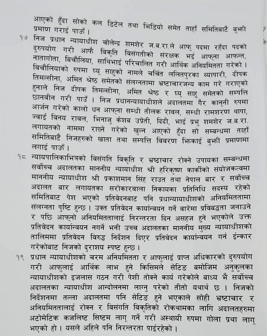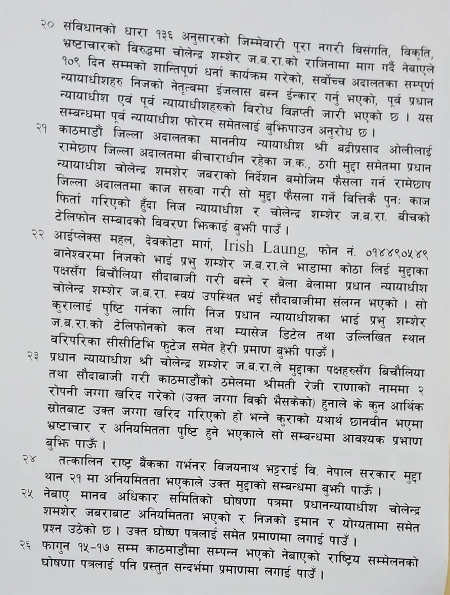 The letter states, “The documents, details, information and other evidences related to the impeachment charges confirming the impeachment motion under Article 101 of the Constitution of Nepal against Chief Justice Rana are attached herewith.”