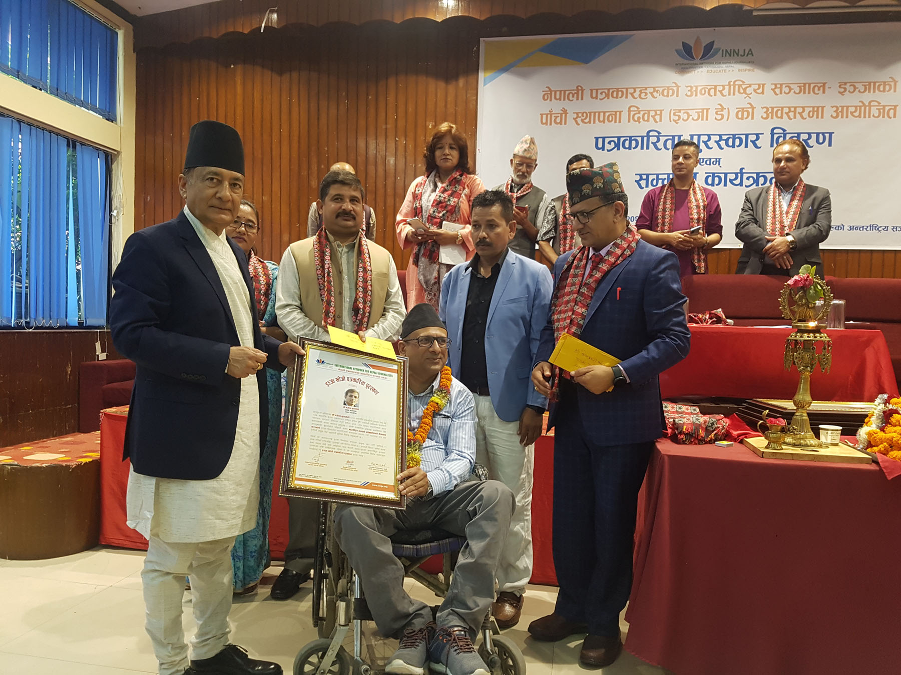 At a program organized in Kathmandu Saturday on the fifth anniversary of INJA, Minister for Communications and Information Technology, Gyanendra Bahadur Karki, honoured Budhathoki with Rs 100,000 and letter of felicitation.