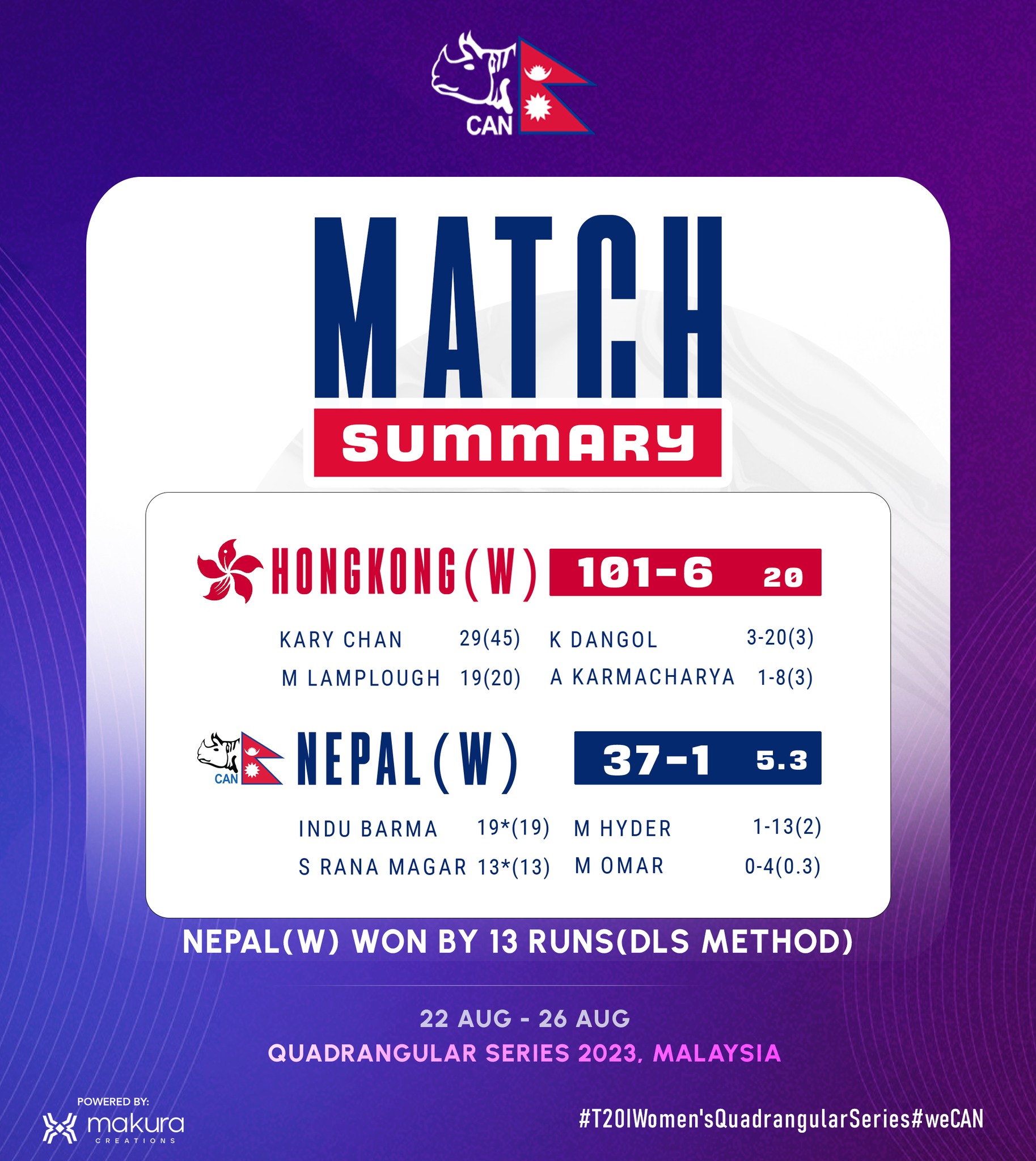 After losing the toss and batting first, Hong Kong gave Nepal a target of 102 runs. Hong Kong managed to score 101 runs after losing 6 wickets in the allotted 20 overs. Coming into batting, Nepal could play only 5.3 overs. The game was canceled due to rain. Nepal scored 37 runs by scoring 1 wicket in 5.3 overs and Nepal managed to win by 13 runs using the Duckworth-Lewis method.