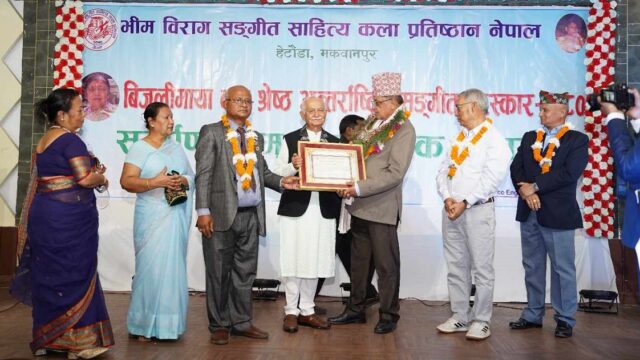 MANAHARI: The Bhim Birag Music Literature Art Academy has feted lyricist Rajendra Thapa and singer